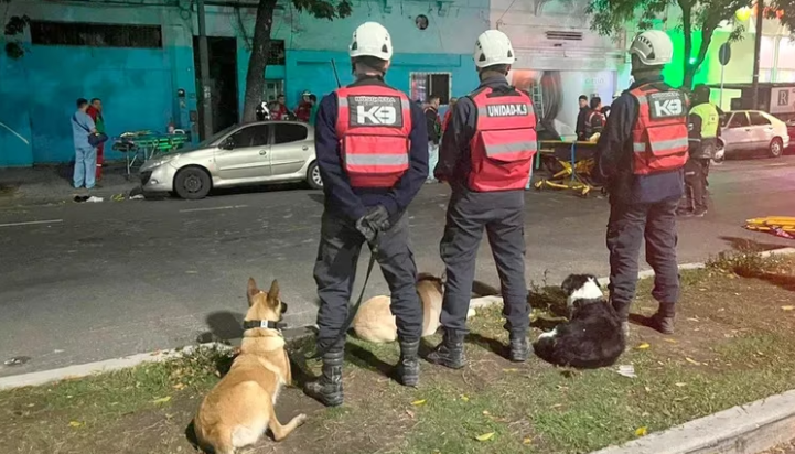 Canes de la División K9 de la Policía de la Ciudad aguardan frente a la vivienda derrumbada en Floresta para reanudar las tareas de búsqueda.