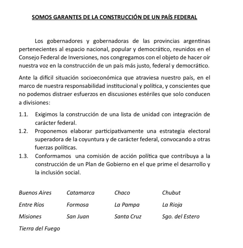 El resultado de este encuentro fue un fuerte llamado a la unificación. “Exigimos la construcción de una lista de unidad con integración de carácter federal”, declaraba el punto central del documento que fue firmado por los presentes.