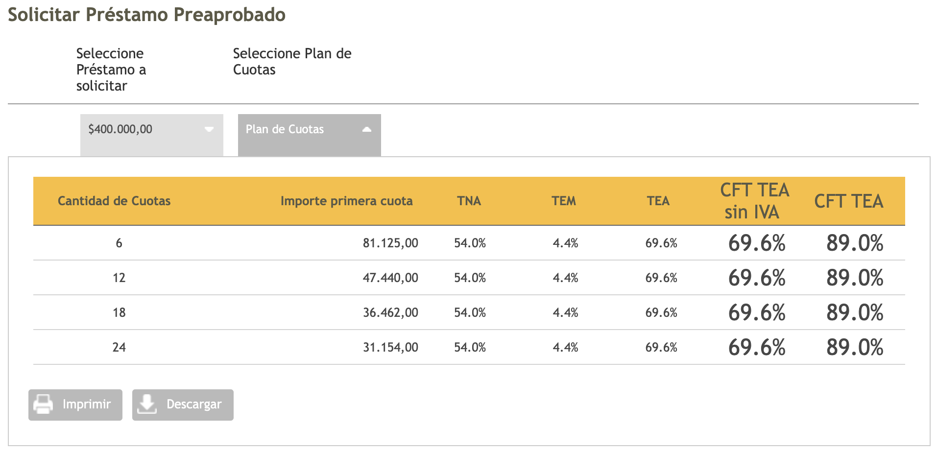 Este préstamo presenta un monto máximo de $400,000, con una tasa para clientes del 54% TNA y un plazo de devolución de 24 meses. Una vez realizada la solicitud electrónica, el banco implementa un proceso de verificación de identidad del solicitante, con un plazo de 48 horas para su cumplimentación.