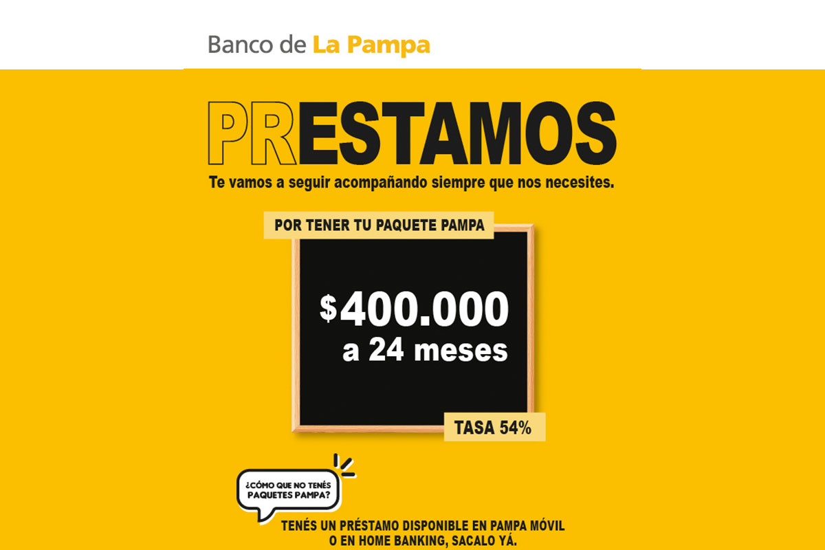 Se destacó también la puesta en vigencia de un nuevo préstamo personal para Paquetes Pampa. Podrán solicitarse de $ 400.000, sin comisión de originación, a una tasa del 54% TNA y un plazo de hasta 24 meses. La cartera asignada es de $ 10.000 millones. Los otros préstamos personales vigentes a través de canal sucursal como Credisueldo y Jubilados/pensionados aumentan el monto disponible hasta $2.000.000 y por canales electrónicos hasta $ 750.000.