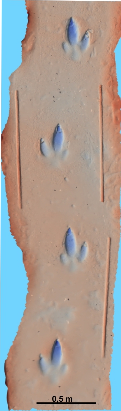 El estudio, encabezado por Ricardo Melchor y publicado en la prestigiosa revista científica Scientific Reports determinó que la zona donde fue localizada el ave era un ambiente desértico con dunas y numerosos lagos extensos que funcionaban como oasis, y donde concurría la fauna de ese momento. En el barro de la costa de uno de esos lagos, quedaron registradas esas huellas de casi 40 cm de largo de este animal bípedo, que muestran un apoyo en dos dedos del pie, el dedo medio y el lateral (muy parecido a los actuales avestruces africanos).
