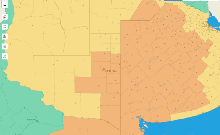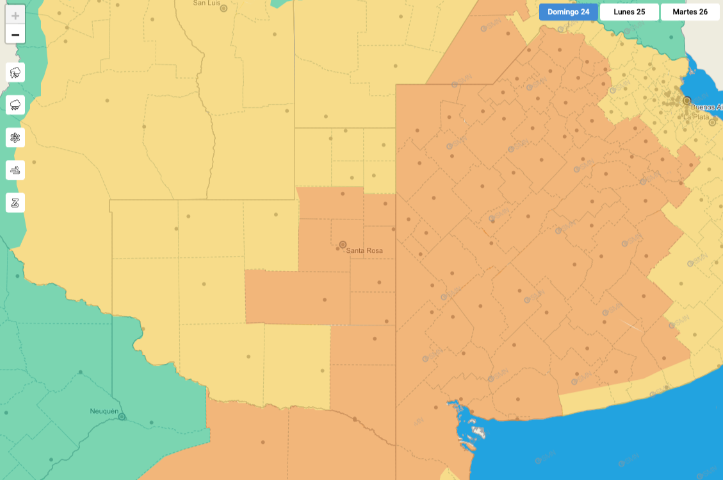 En el caso del Alerta Naranja, que será solo por la tarde de hoy, (ver imagen que acompaña la nota), alcanza a la zona de Santa Rosa, Toay, Winifreda, General Acha, Catriló, Lonquimay, Uriburu, Anchorena, Doblas Miguel Riglos, Macachín, Jacinto Arauz, San Martín, Bernasconi, La Adela y otros pueblos del sudeste.