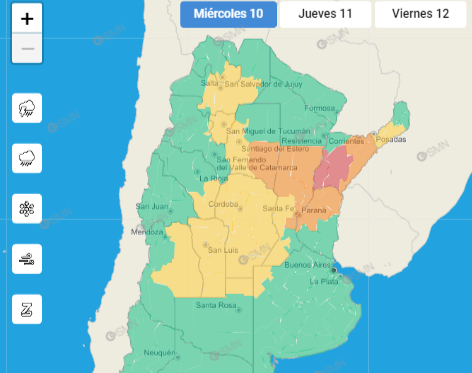 El organismo oficial indicó que el área será afectada por tormentas, algunas localmente fuertes. Las mismas estarán acompañadas por ráfagas intensas, fuerte actividad eléctrica, ocasional caída de granizo y abundante caída de agua en cortos períodos. Se estiman valores de precipitación acumulada entre 30 y 60 mm, pudiendo ser superados en forma puntual.