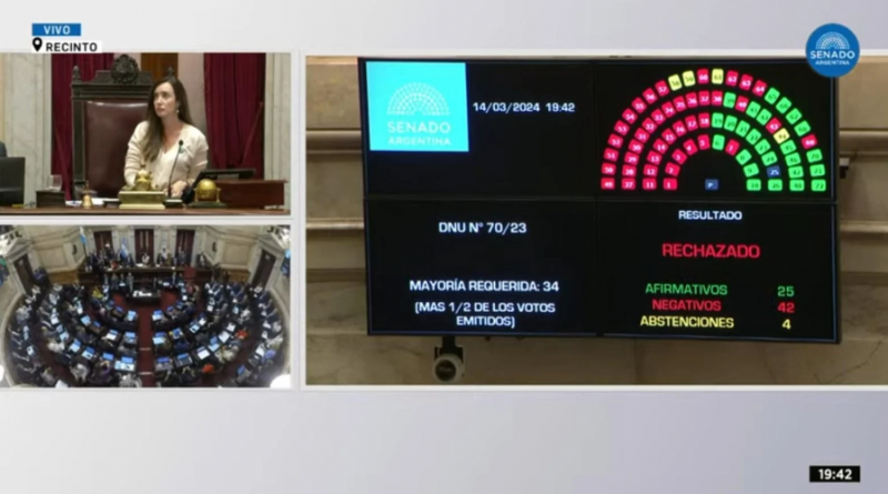 La medida emitida por el Presidente durante el mes de diciembre obtuvo 42 votos en contra, 25 a favor y 4 abstenciones. La Libertad Avanza había propuesto pasar la discusión para fin de mes, pero la cámara lo rechazó. En la sesión especial también se aprobó la reforma de la Ley de lavado de activos.