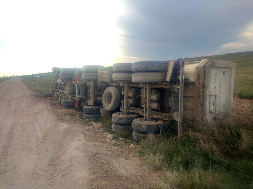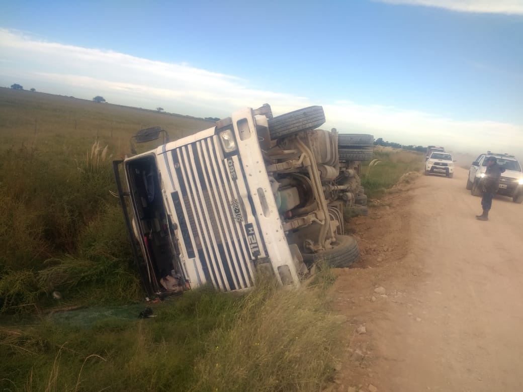 El incidente fue comunicado esta tarde por el personal policial de la Departamental de Realicó por el vuelco de un camión con acoplado en un camino vecinal desde Falucho hacia la Ruta Nacional 35 sobre un alteo entoscado que se desmoronó.