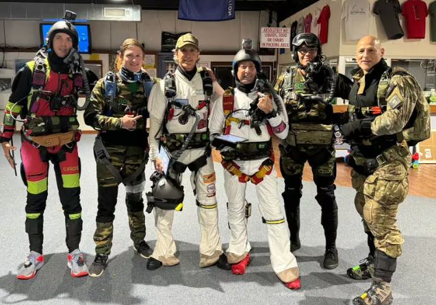 Marcelo Vives y Alejandro Montagna, los paracaidistas argentinos de blanco que lograron un récord de salto nocturno, junto al resto del equipo