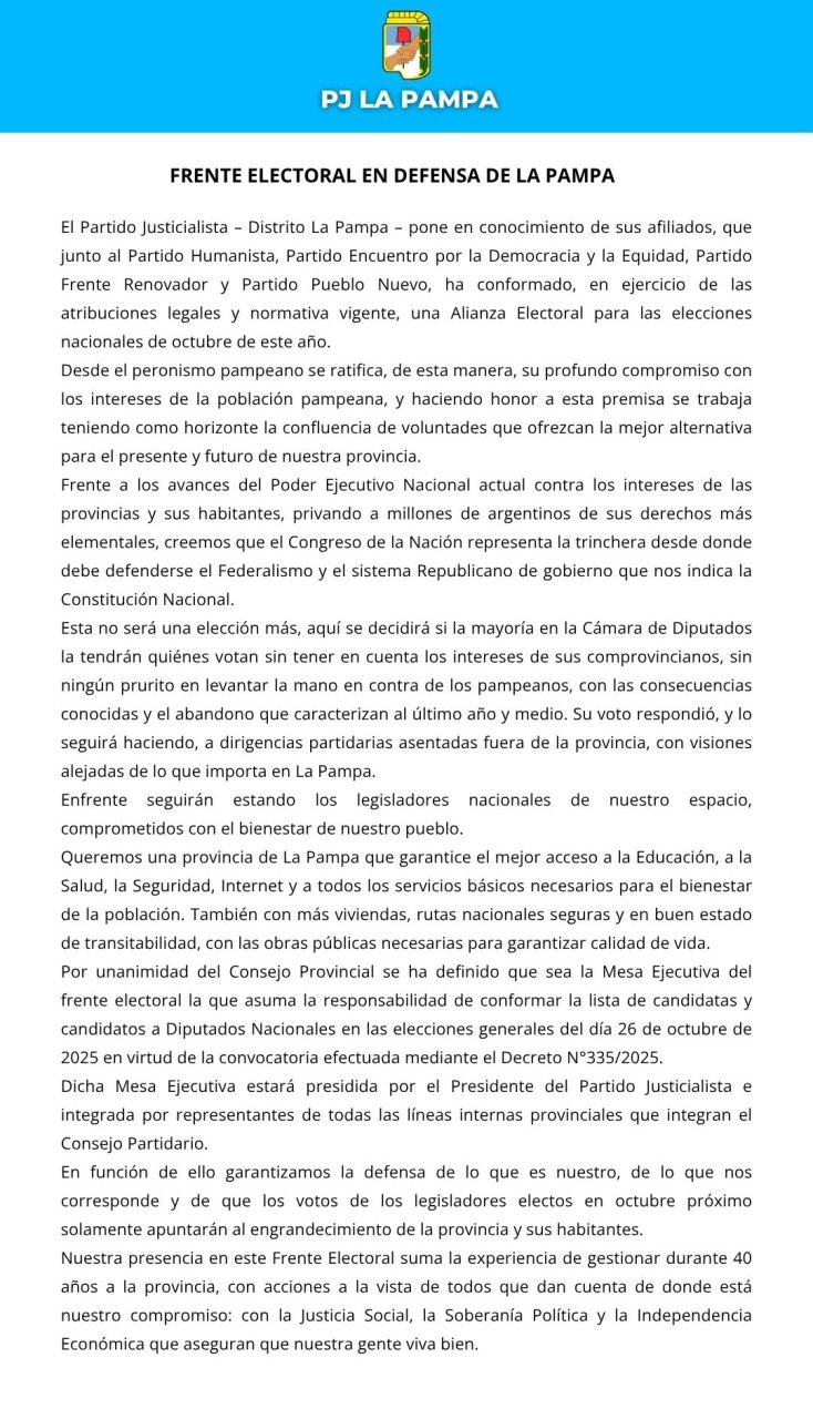 El Partido Justicialista de La Pampa anunció la creación del “Frente Electoral en Defensa de La Pampa”, una alianza estratégica de cara a las elecciones nacionales legislativas que se celebrarán en octubre de este año. La coalición buscará, según manifestaron, proteger los derechos y recursos de la provincia en el Congreso de la Nación.