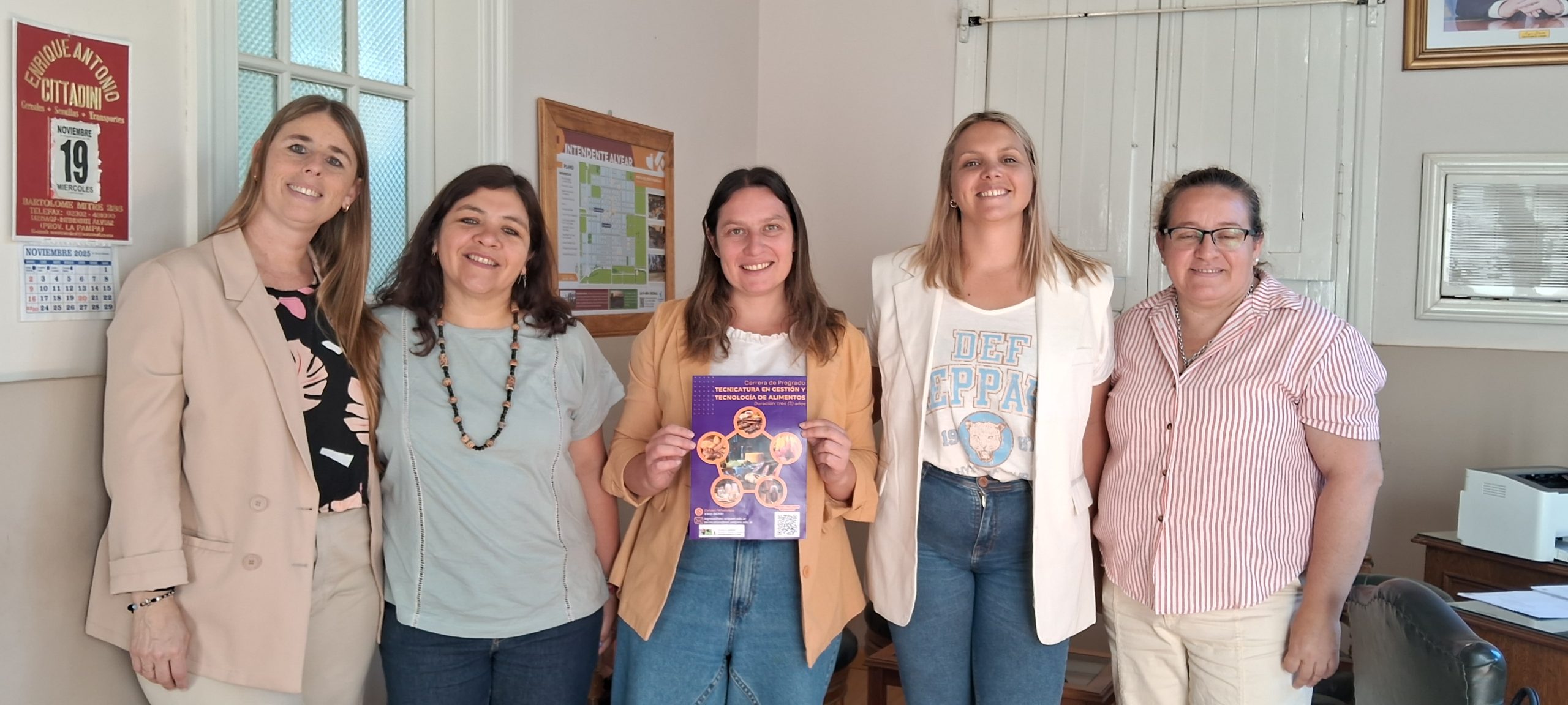 La intendenta Agustina García mantuvo una reunión de trabajo con autoridades académicas de la Universidad Nacional de La Pampa para avanzar en la implementación de la Tecnicatura en Gestión y Tecnología de Alimentos. Participaron del encuentro la Esp. Mariana Forte, Coordinadora de la Tecnicatura y Prosecretaria Académica de la FCV, Mg. Emilce Rojo, Secretaria Académica de la FCV, Esp. Leticia Gomez, Tutora Académica y Coordinadora de Prácticas Comunitarias de la Tecnicatura y Celéste Álvarez Direcora de Bromatología, Zoonosis y San.Ambiental de la Municipalidad.