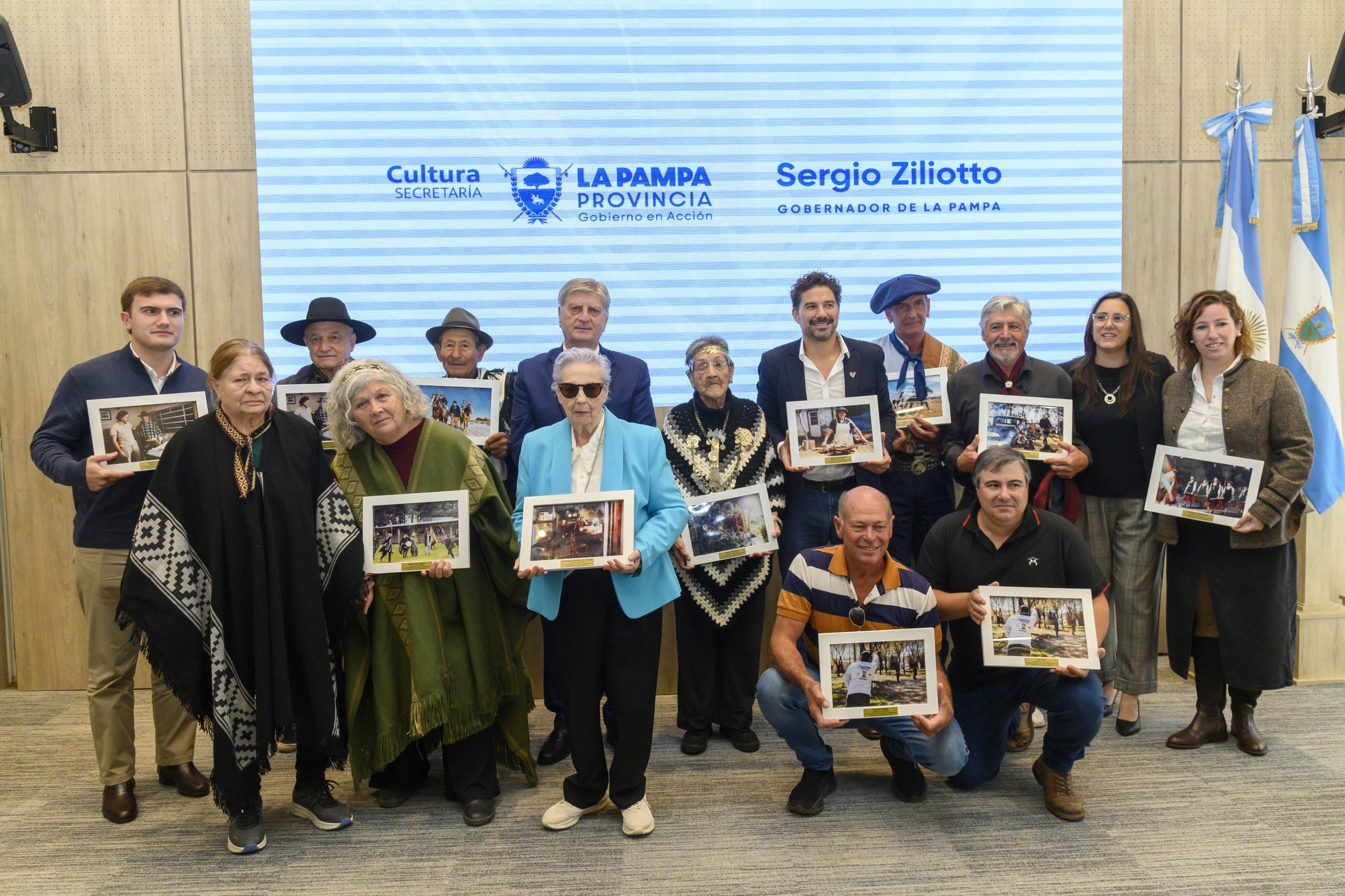 Durante el acto también se entregaron presentes a “Portadores”, en reconocimiento a su aporte a la salvaguarda del Patrimonio Cultural Inmaterial. Recibieron distinciones Antonela Mujica Veroli (Danzas Vascas, Macachín); Joaquín Cerda (Velada del Santo, Puelén); Susana Noemí Cuello (Trabajo en cuero, Santa Isabel); María Inés Canuhé (Chueca/Palín, Toay); Juana Vila Rosa (Conocimiento sobre hierbas medicinales, Toay); Iris Marcela Molinero de Gorondi (Elaboración de chacinados, Luan Toro); Matías Dos Santos y Juan Esteban Ugartemendía (Soguería, General Acha); Rubén Martín (Tropillas entabladas y entrevero, Ingeniero Luiggi); Edgardo Ruppel y Luis Fetter (Kosser, Guatraché); y Jorge Basso (Asado a la estaca, Maisonnave).