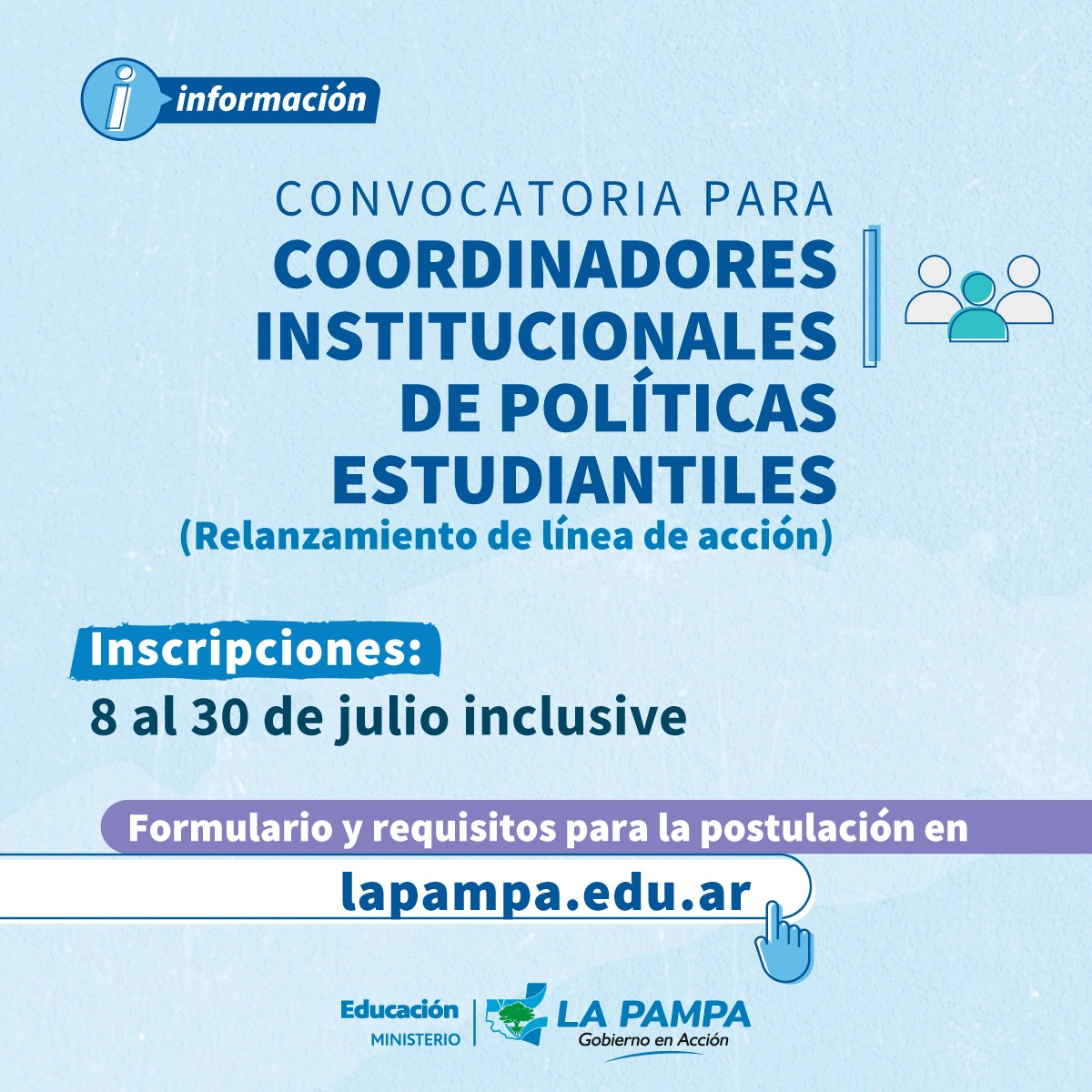 La Dirección General de Educación Superior recordó que hasta el 30 de julio inclusive, estará abierta la inscripción sobre la línea de acción de Coordinadores Institucionales de Políticas Estudiantiles (CIPEs) con el objetivo de fortalecer la implementación y el desarrollo de Políticas Estudiantiles, apoyando a las instituciones en el diseño, coordinación e implementación de acciones concretas.