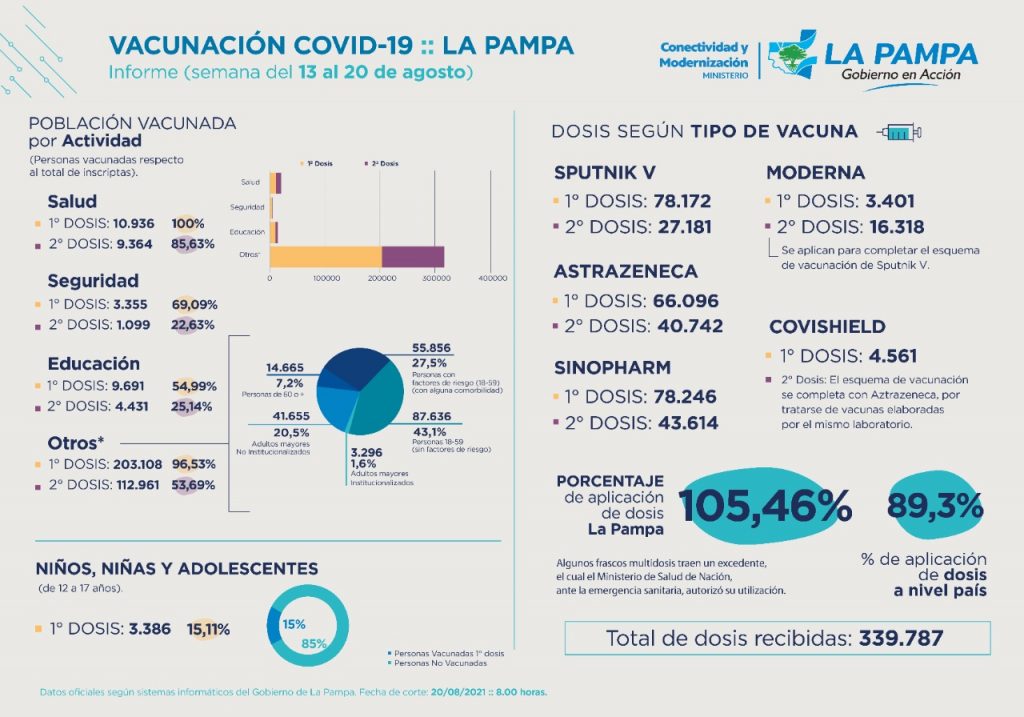 El Poder Ejecutivo provincial, a través de los Ministerios de Conectividad y Modernización, y de Salud, informó en los cuadros estadísticos la marcha del Plan de Vacunación contra la COVID-19 en la provincia de La Pampa.