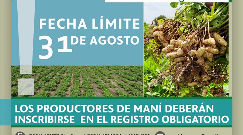 El Ministerio de la Producción a través de la Dirección de Agricultura recuerda a los productores de cultivo de maní, que hasta el 31 de agosto está abierta la inscripción obligatoria en el Registro de Planes de Manejo de Cultivos de Productores Agrícolas de la Provincia de La Pampa.