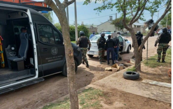 “En la madrugada del domingo personal policial recepcionó una denuncia de una joven de esta localidad denunció haber tenido un altercado en la salida de un bar ubicado en diagonal Aubin con personas que habían quedado fuera del local, y que posteriormente habría sufrió amenazas por parte de dos mujeres con las que había tenido el altercado, las presuntamente le exhibieron un arma de fuego. En relación al hecho se labran actuaciones por S/LESIONES AMENZAS con intervención de la fiscalía Temática de Delitos contra las Personas de la ciudad de General Pico a cargo del Dr. GUILLEMRO KOMAROSKY, En horas del medio día Personal del Grupo Especial Policial a cargo del Comisario Martin PORTILLO y personal de la comisaría de Intendente Alvear a cargo del Subcomisario Carlos VILLEGAS realizaron un allanamiento en un domicilio de la calle José Hernandez, donde se secuestraron elementos de interés para la causa y se procedió a la demora de una persona en relación a la causa judicial.”