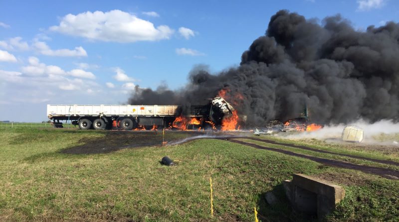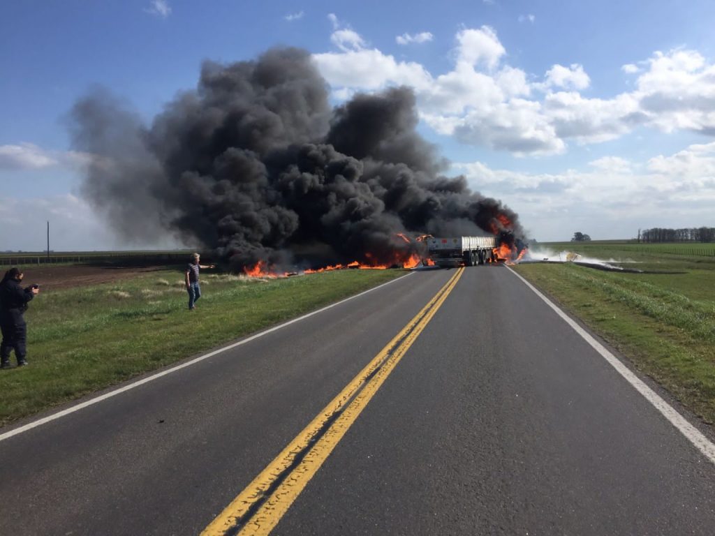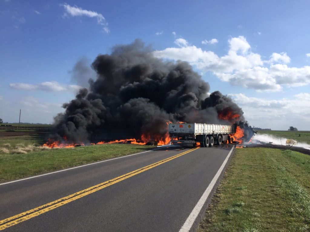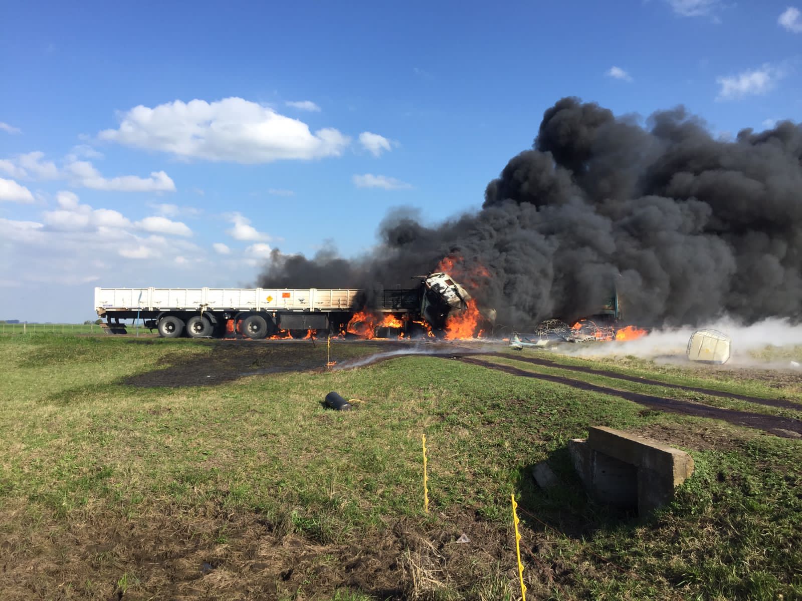 Tras chocar ambos transportes, tomaron fuego por lo que debieron llamar a los Bomberos Voluntarios de General Alvear. Uno de los camiones transportaba productos químicos, y el otro camión transportaba animales vacunos.