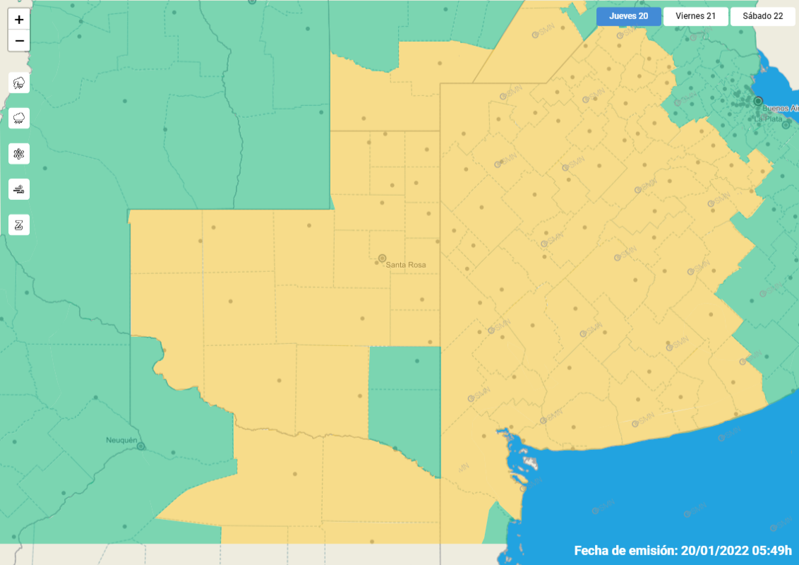 El Servicio Meteorológico Nacional emitió un alerta por tormenta para casi toda la provincia. Según indicaron el área marcada en amarillo en la imagen “será afectada por lluvias y tormentas de variada intensidad, algunas localmente fuertes o severas, acompañadas de intensas ráfagas, caída de granizo, fuerte actividad eléctrica y fundamentalmente abundante caída de agua en cortos períodos”.