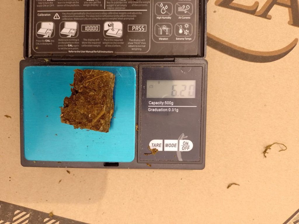 En el lugar, se hallaron y secuestraron un trozo de marihuana desmenuzada, arrojando un peso de 24,7 gramos; un envoltorio con un trozo compacto de misma sustancia, arrojando un peso de 43,13 gramos; y tres cigarrillos que arrojaron un peso de 0,94 gramos. De esta forma, se secuestró un total de 68,77 gramos de marihuana.