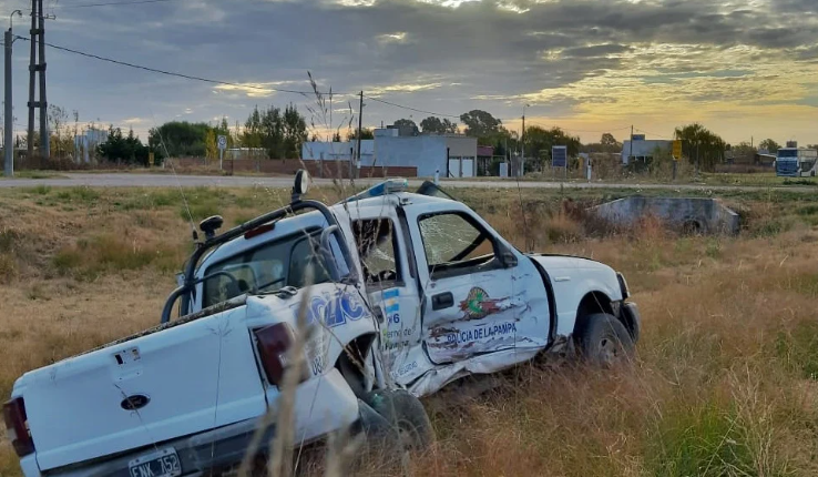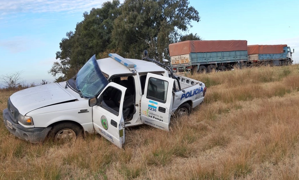 La camioneta de la policía quedó destruida después del impacto con el camión. Tras el choque, el móvil policial terminó en la banquina, mientras el camión sobre la cinta asfáltica.