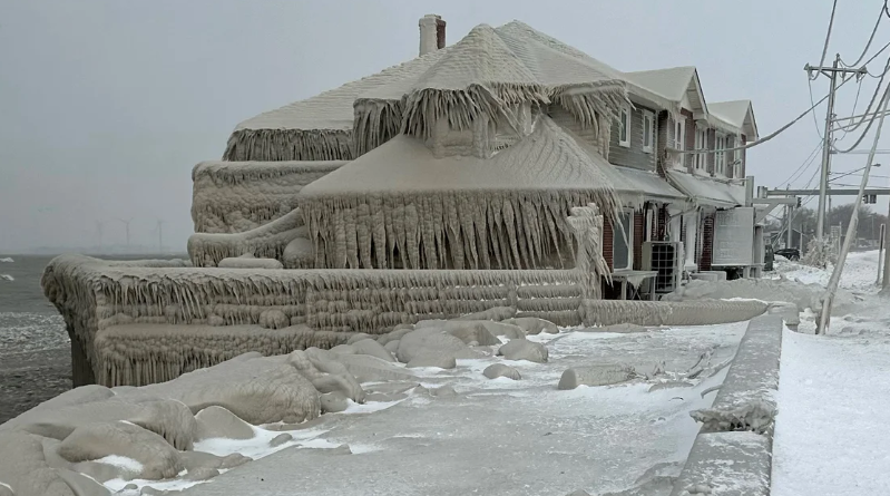 El restaurante de Hoak está cubierto de hielo por el rocío de las olas del lago Erie durante una tormenta de invierno que azotó la región de Buffalo en Hamburgo, Nueva York.