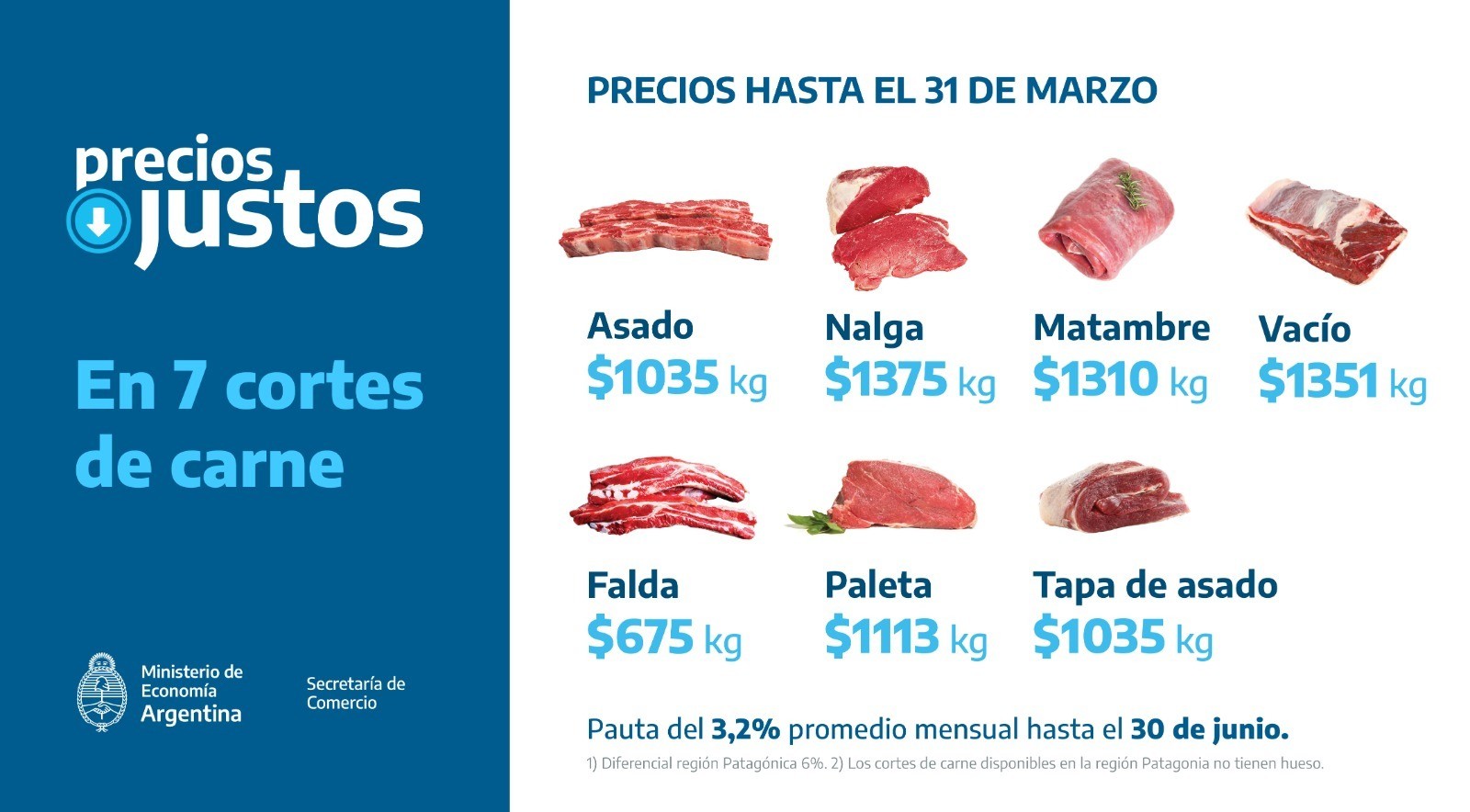 Precios Justos Carne, es la inclusión de los 7 cortes cuidados al programa de precios justos con precios diferenciales y un sendero de precios previsible. Los precios acordados se mantendrán hasta el 31 de marzo y luego estos cortes tendrán una pauta del 3,2% hasta el 30 de junio. Estos precios se podrán encontrar desde el viernes.