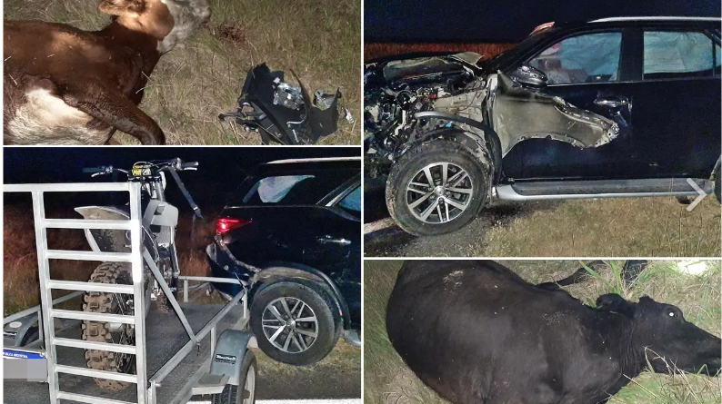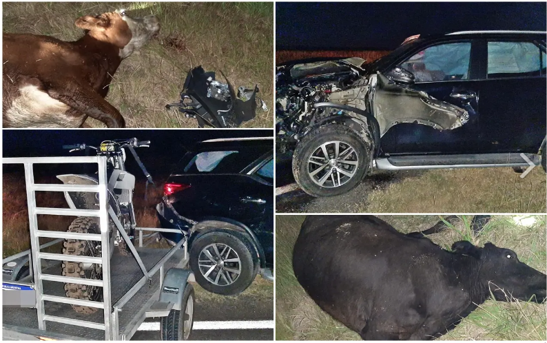 Pudo ser una tragedia: Camioneta con trailer chocó en plena ruta dos vaquillonas sueltas